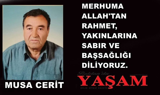 28 Eylül 2024 - Bozalan mahallesinden, merhum Hasan oğlu Musa Cerit vefat etmiştir. Buldan’da Yaşam Gazeteesi olarak merhuma Allah’tan rahmet, yakınlarına sabır ve başsağlığı dileriz.